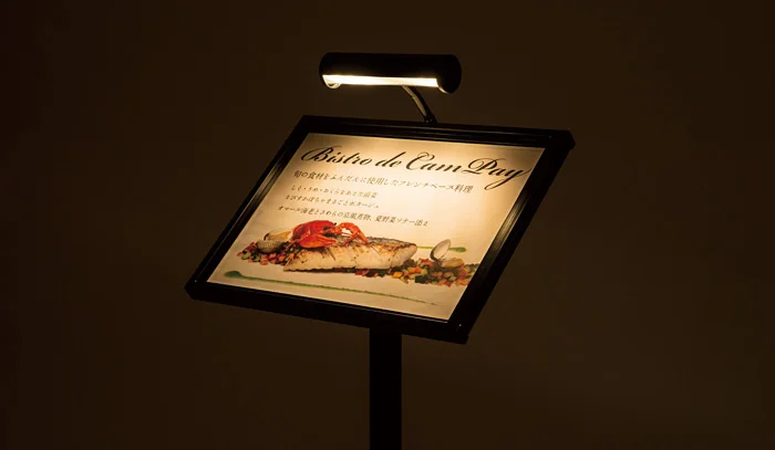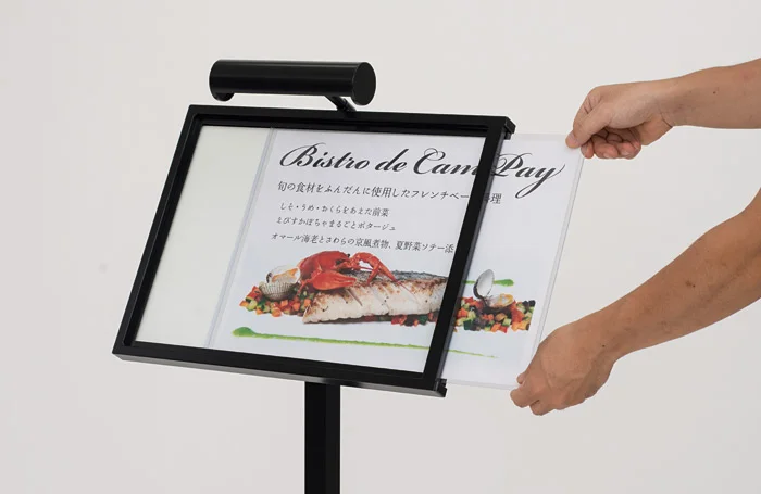 カードケースタイプで広告面の入れ替え楽々!暗い所でも安心の屋外対応LED付メニュースタンド