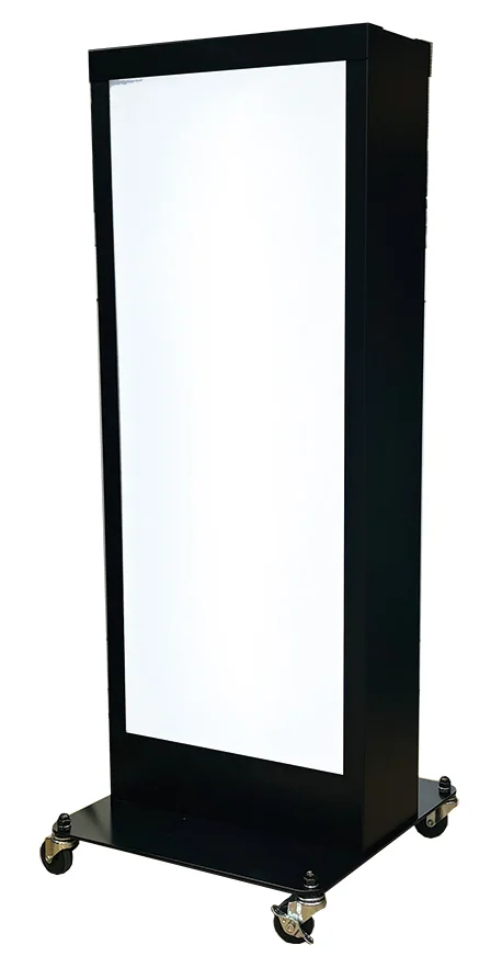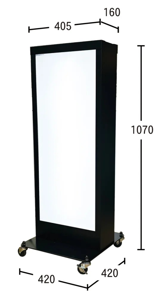 - 全高1070mm・幅420mmのコンパクト設計で、狭い店頭や通路脇にも圧迫感なく設置できる電飾スタンド看板です。