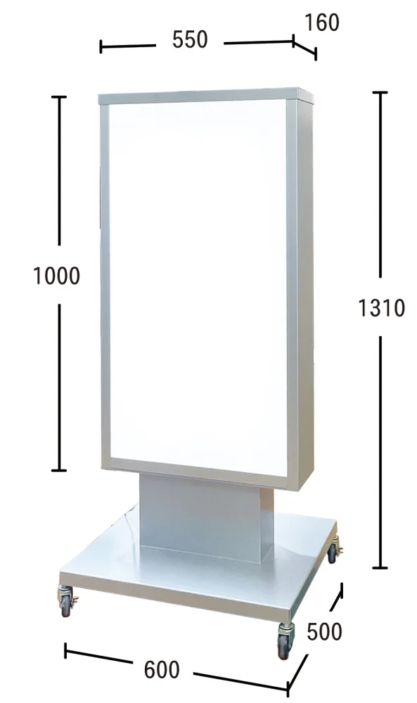 - 全高1310mmの扱いやすいサイズで、店頭にちょうど良い存在感を持つ電飾スタンド看板です。