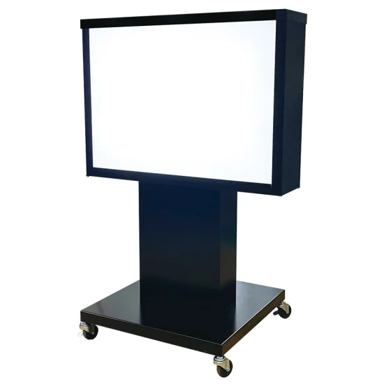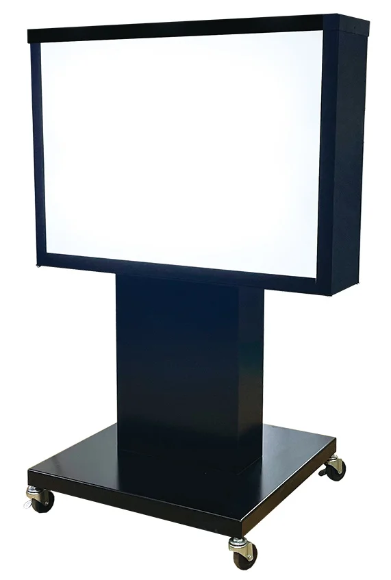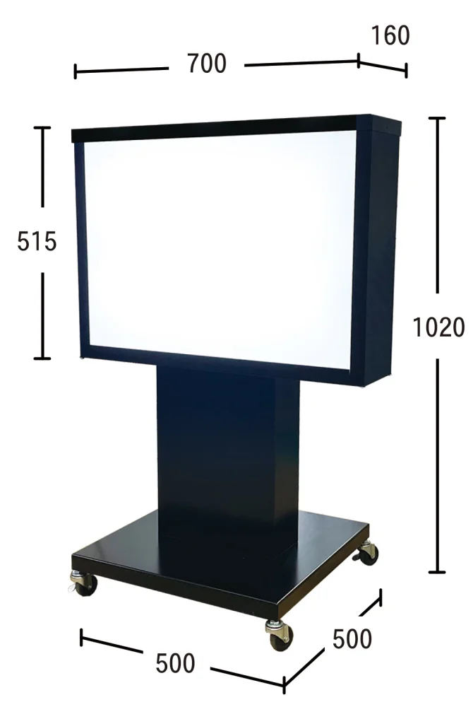 - 全高1020mmのロースタイルに、横長ワイドな表示面(440×640mm)を組み合わせた個性的なフォルムの電飾スタンド看板です。
