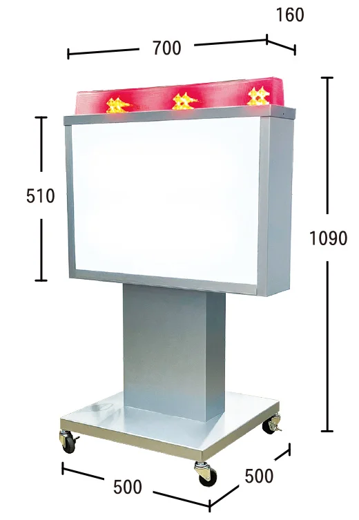 - 全高1090mmのコンパクトボディの上部に16個のLEDモジュールを搭載した、アイキャッチ効果の高い電飾スタンド看板です。