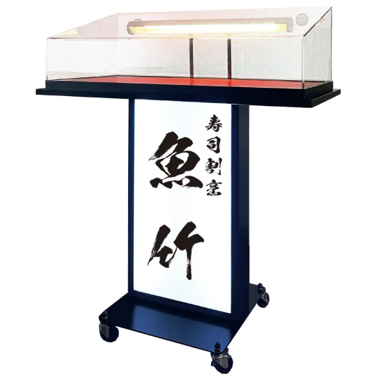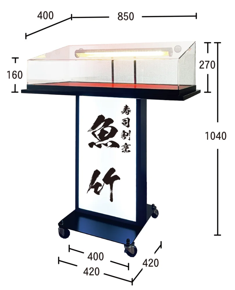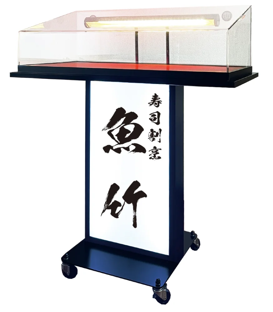 - 上部に大型アクリルケース(4mm)、下部に広い電飾メニュー表示面を備えた、存在感のあるサンプルケース付メニュースタンドです。