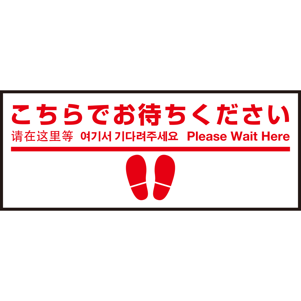 床面サイン フロアラバーマット W75cm×H30cm こちらでお待ちください005 (足跡・白線・文言) 防炎シール付 Eタイプ (PEFS-005-E)