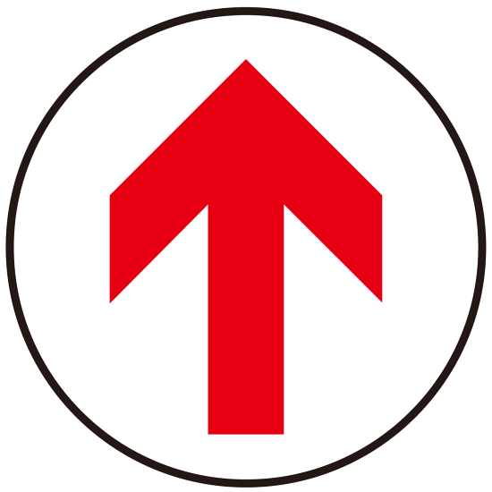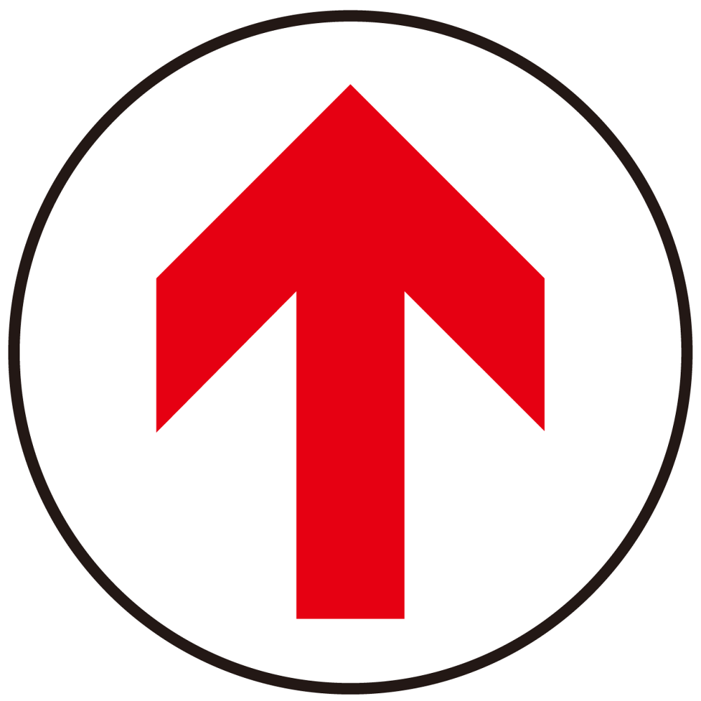 シンプルに矢印のみを表示したデザイン。円形なので設置方向を選びません。汎用的なデザインでアイディア次第で様々な誘導にご利用いただけます。