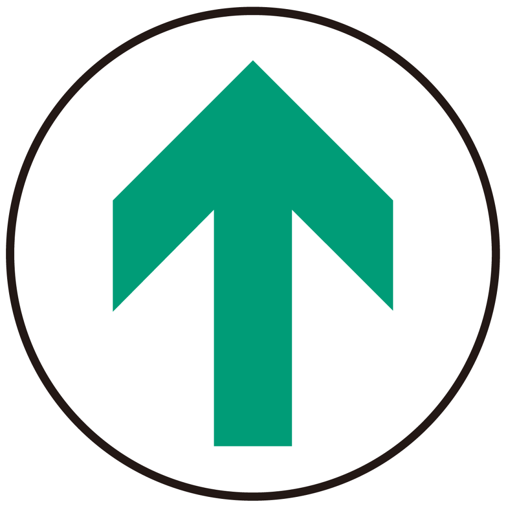 シンプルに矢印のみを表示したデザイン。円形なので設置方向を選びません。汎用的なデザインでアイディア次第で様々な誘導にご利用いただけます。