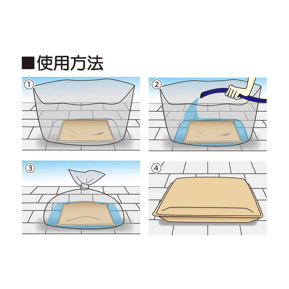 - 1.膨潤時に使用した専用ポリ袋に使用済みのスーパーブロックを入れ脱水処理剤「アイパックC-210」(別売)を全体に振りかけます。