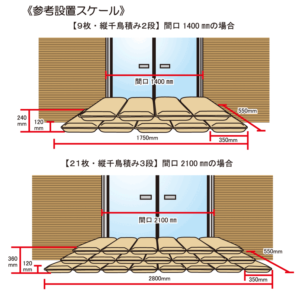 - ●止水用にご使用の場合は予想上昇水面より1段以上積み上げて下さい。(コンパネ等を止水板として使用することで積み上げが安定し止水効果が安定します。)