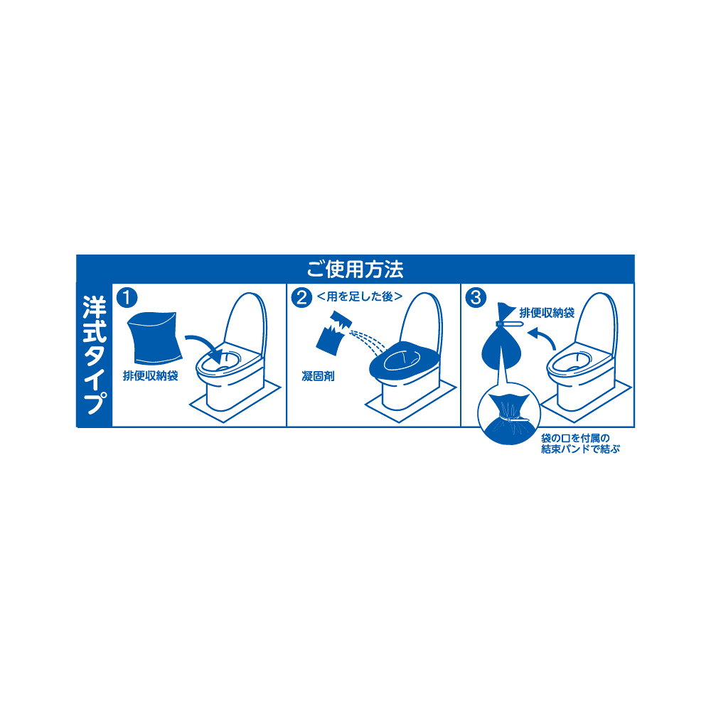- 3.排便収納袋を便座から外し、袋の口をしっかりと結び、可燃ごみとして処分してください。