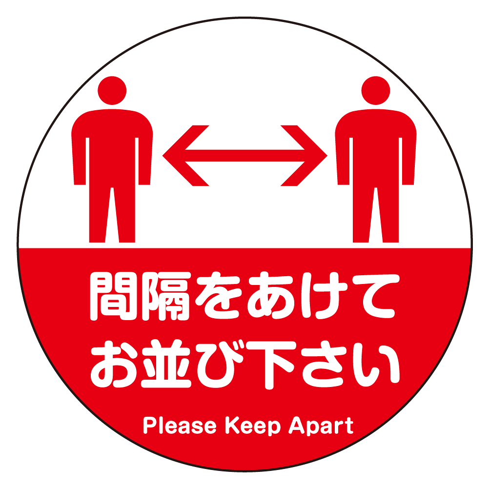 フロアシート 糊付丸形 Φ30cm 「間隔をあけてお並び下さい(人型シルエットデザイン)」床面滑り止め加工ラミネート仕様 レッド
