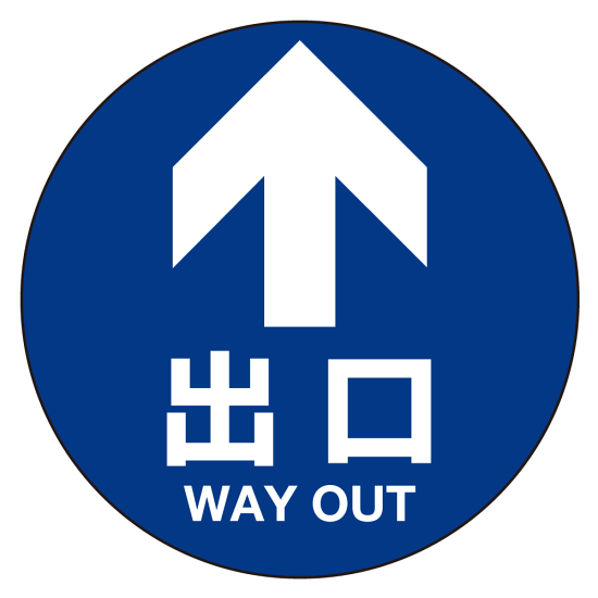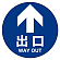 商品説明:フロアシート 糊付「矢印・出口」床面滑り止め加工ラミネート仕様 白文字/青地 丸形(Φ30cm)