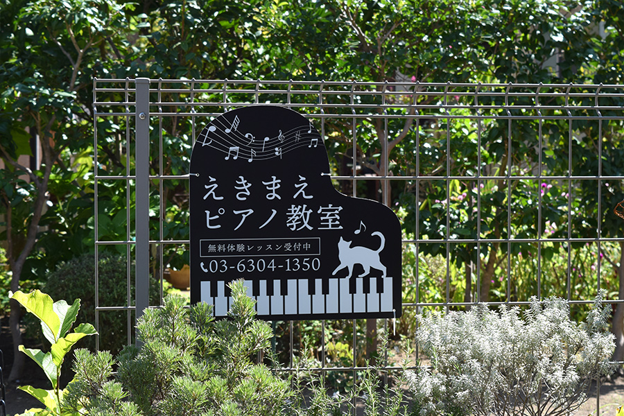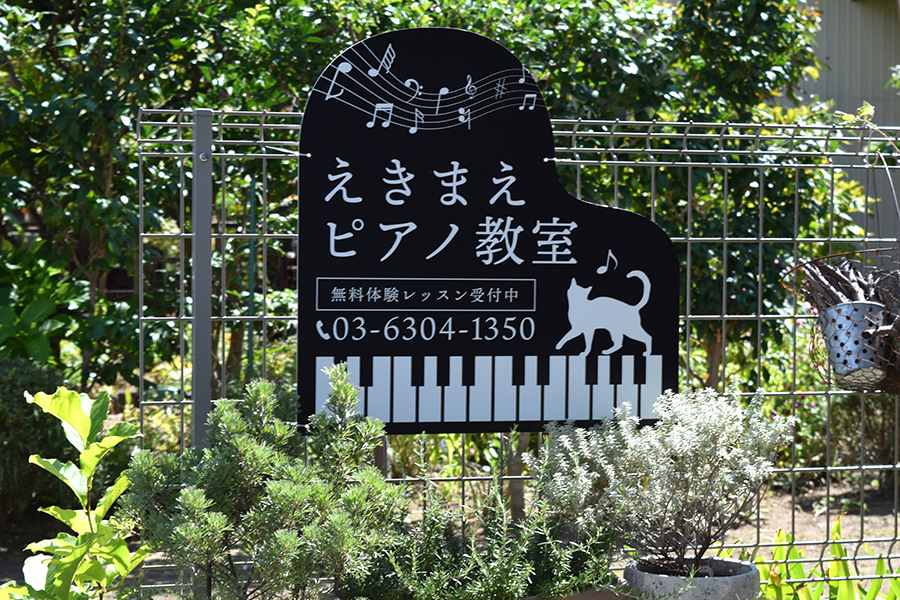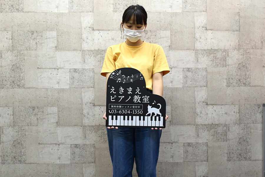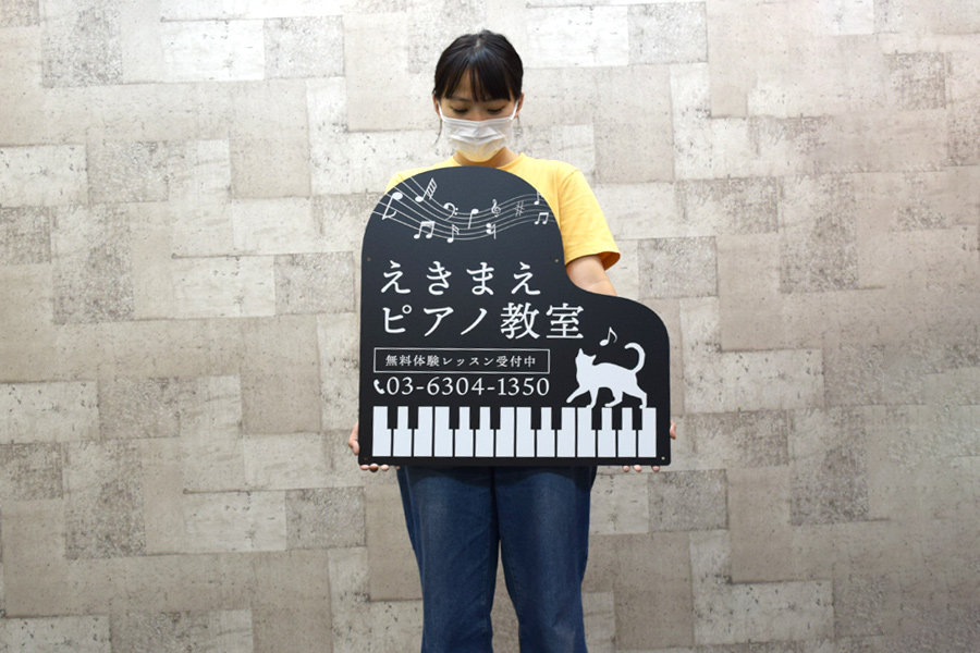 思わず目を引くピアノ型のプレート看板もご用意。パッと見ですぐにピアノ教室と分かるピアノ型はアイキャッチ抜群!