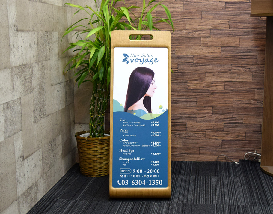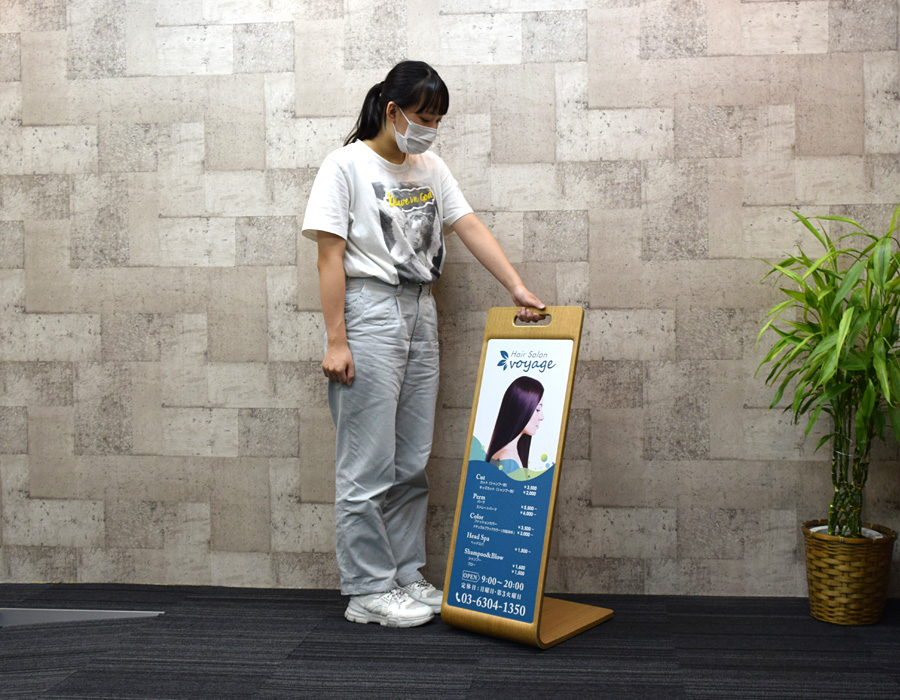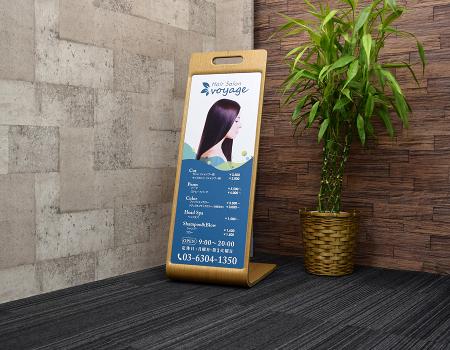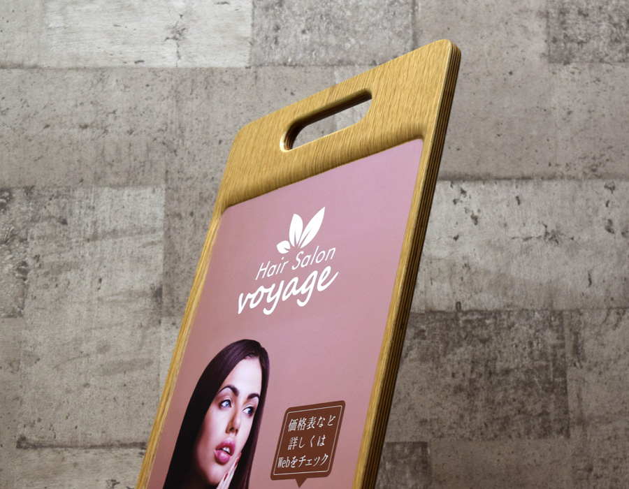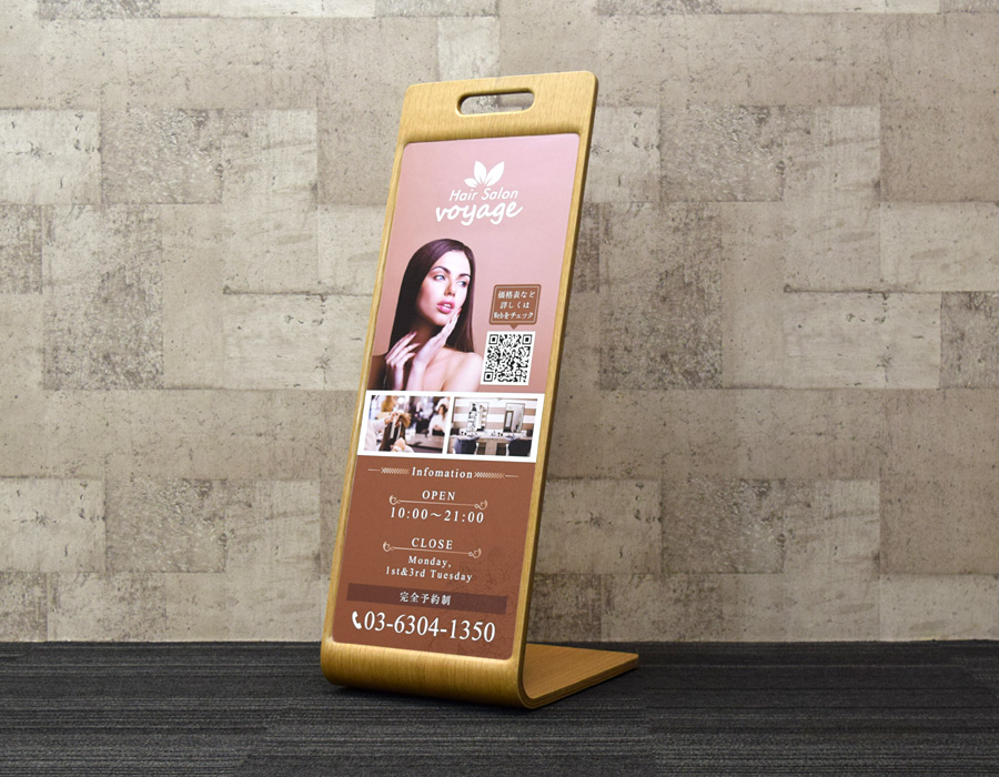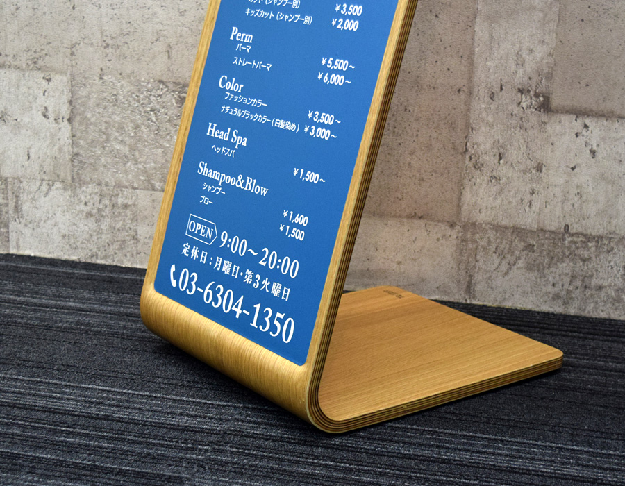 曲線美が美しいプライウッドサインスタンドは、美容室やサロンなどの美的感覚の高いお客様が訪れる店舗に最適なナチュラルテイストのスタンド看板です。