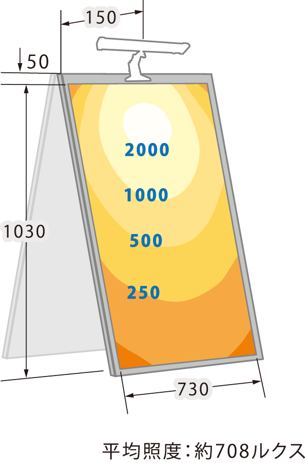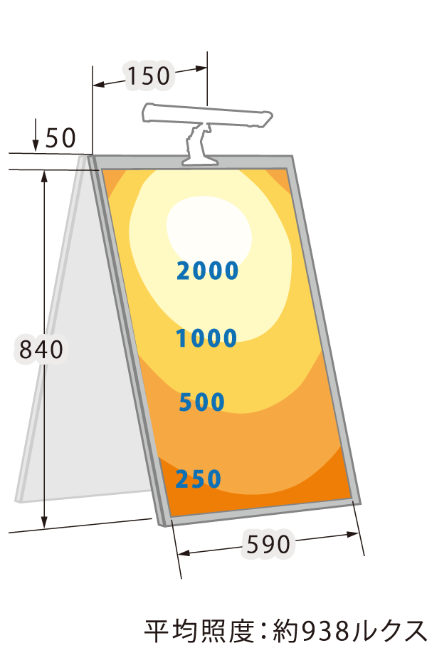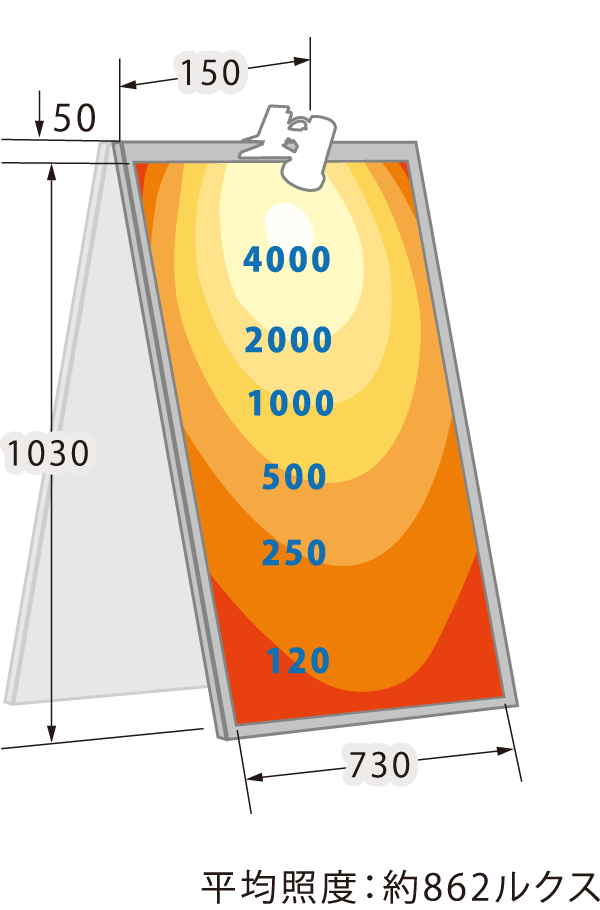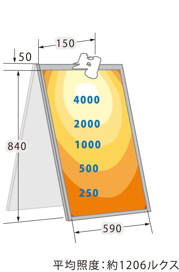 偏光レンズで下まで明るく。A型看板でもっとも使われているA1サイズ~B1サイズに照準を合わせ最適化した偏光レンズを採用。偏光レンズによって看板の下部までしっかり明るく照射致します。