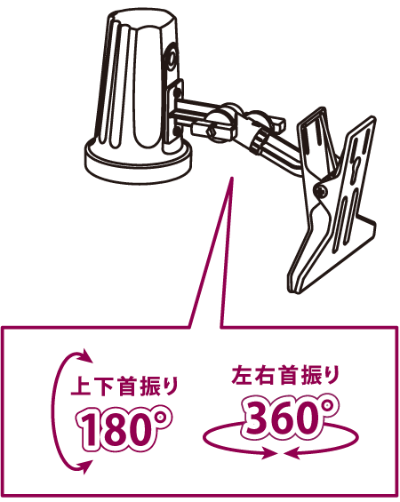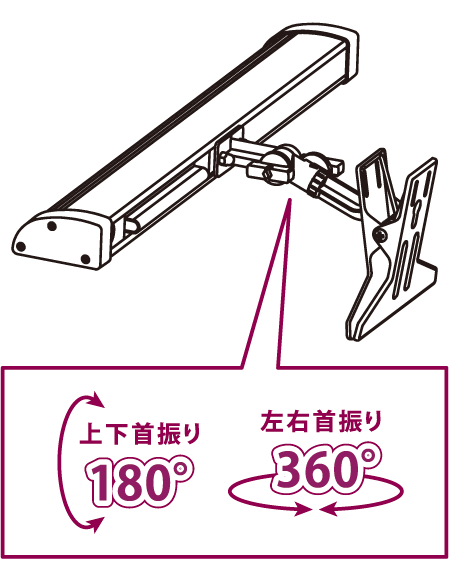 首振り機能付きでセンターからずらして取り付けても角度を付けて板面を照らすことができます。