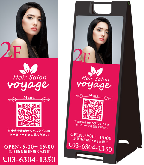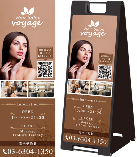 スタンド看板の中には簡単にデザインを差し替えられるタイプもあり、常に最新のカットモデルの写真を掲載することができます。さらに、カットモデルの写真を掲載したポスターフレームをイーゼルスタンドに飾るなど、美容室のブランドイメージ向上に役立ててください。