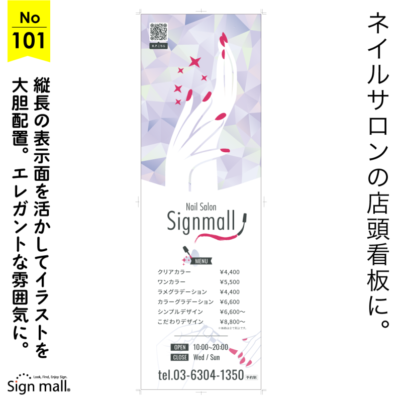 縦長を活かしたイラスト大胆配置のエレガントなネイルサロン向け看板デザイン例