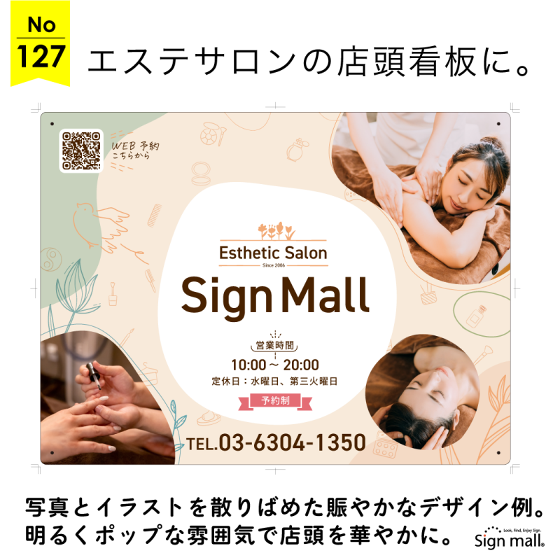 写真とイラストを散りばめた明るく親しみやすいエステサロン様向け看板デザイン例