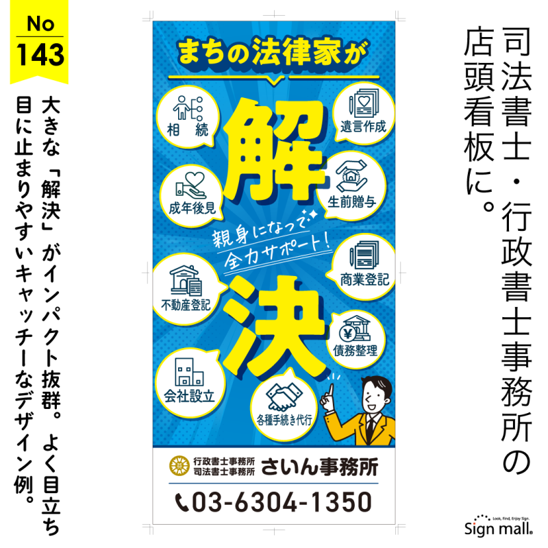 この看板は、大きな「解決」という言葉が目を引くポップでインパクトのあるデザインに仕上げました。