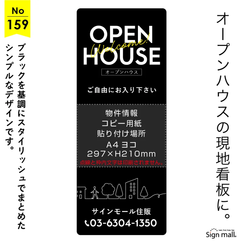 さらに、「OPEN HOUSE」というキャッチフレーズにイエローのアクセントを加えることで、見る人の目を引き、特別感をプラスしました。設置場所を選ばずに活用できるシンプルなデザインですが、細部にこだわることで高級感も感じられる仕上がりとなっています。