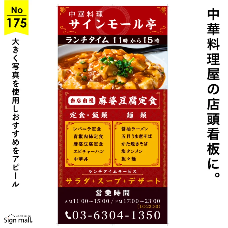 写真で引き込む大きなメニュー表示の中華料理屋の店頭看板デザイン例