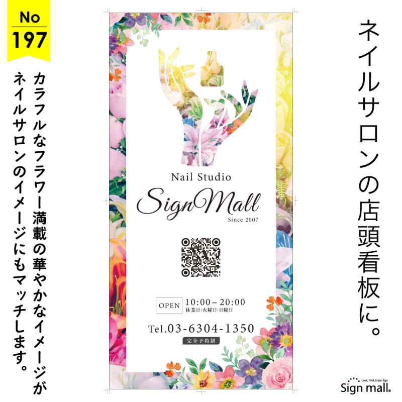 カラフルな花々が額縁のように看板を彩り、サロンの華やかさとフェミニンな雰囲気を演出。中央のデザインには、花のテクスチャを活かしたハンド&ネイルシルエットを配置し、ネイルの美しさとトレンド感を表現しています。