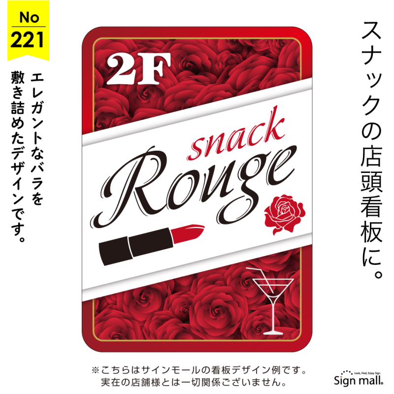 こちらのデザインは、赤いバラを背景いっぱいに敷き詰めて、シンプルでありながらも華やかさと高級感を兼ね備えたスナック向けの看板です。