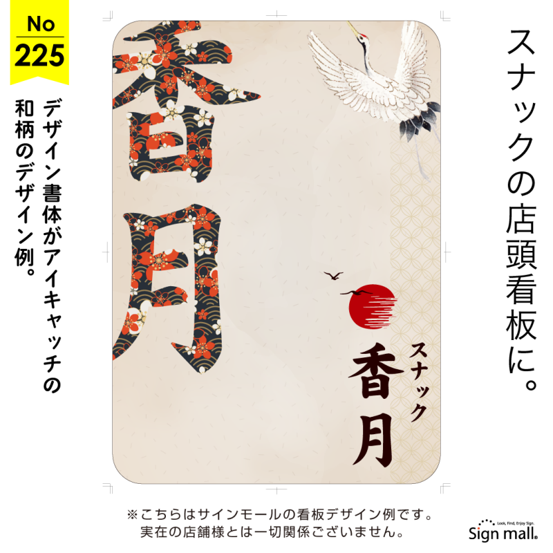 こちらのデザインは、華やかな和柄を文字に取り込むことで、ひと目で印象に残るインパクトのある看板に仕上げたスナック向けデザインです。