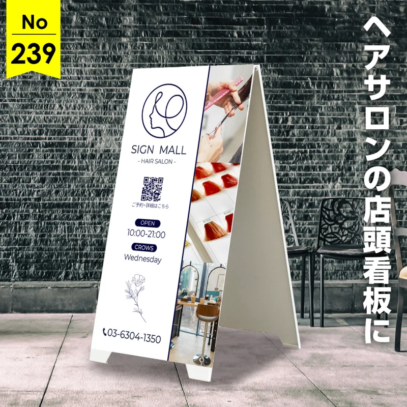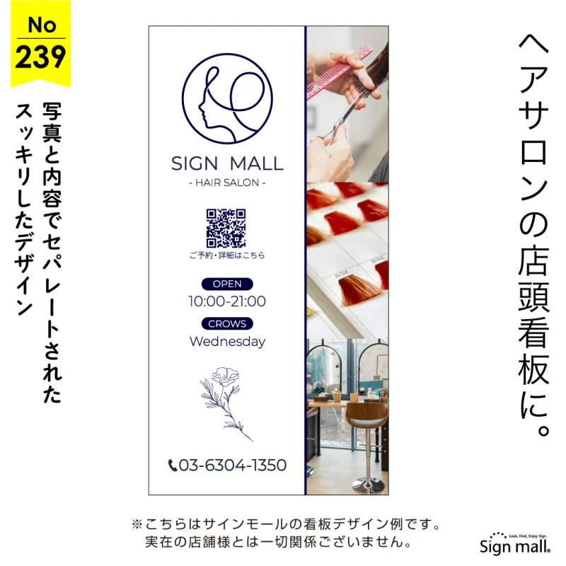こちらのデザインは、写真と文字情報を左右でしっかり分けた、スッキリとした印象の美容院向け看板です。
