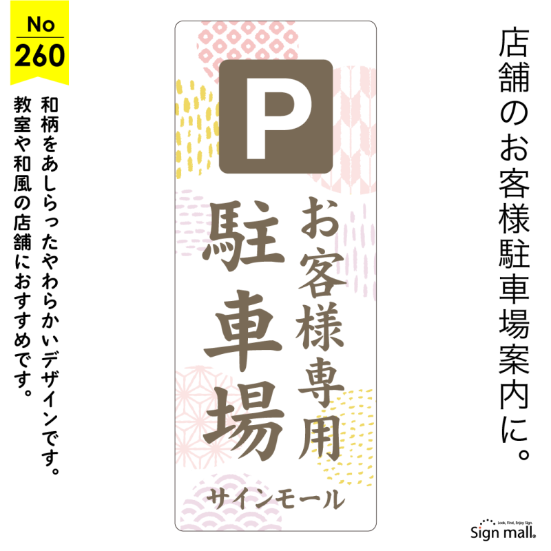 こちらのデザインは、伝統的な和柄パターンをベースに、やさしい色合いと柔らかな書体を組み合わせた、和の雰囲気が漂う駐車場案内看板です。