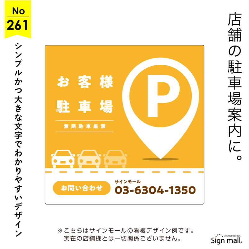駐車場の案内としてしっかり機能するよう、大きく「P」マークを配置した目を引くデザインです。
