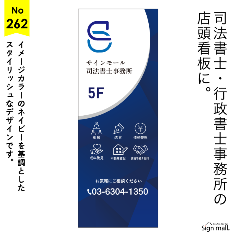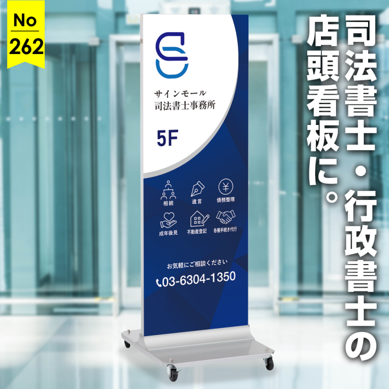 こちらのデザインは、司法書士・行政書士事務所様の信頼感や安心感をしっかり伝えながらも、視認性の高いレイアウトを意識して制作した店頭看板です。