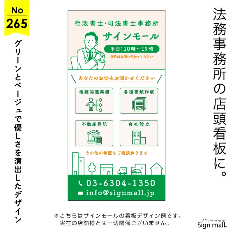 やさしい配色の親しみやすいイラスト付きの行政書士・司法書士向け看板デザイン例