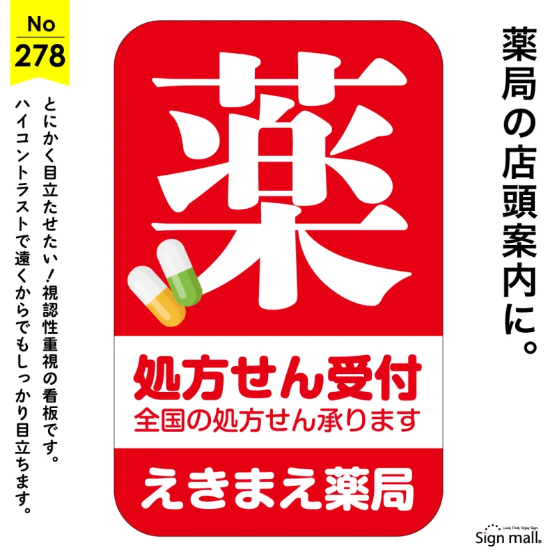 「薬」の大きな文字を中心に、処方せん受付の案内や薬局名もバランスよく配置。