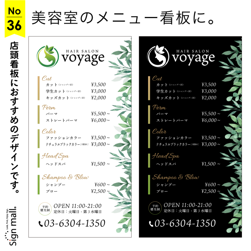 白色の看板にはナチュラルテイストが高まり、黒い看板ではグリーンが引き立ちデザインにインパクを与えます。