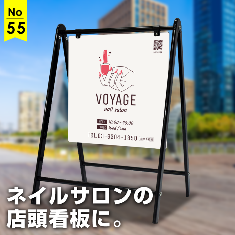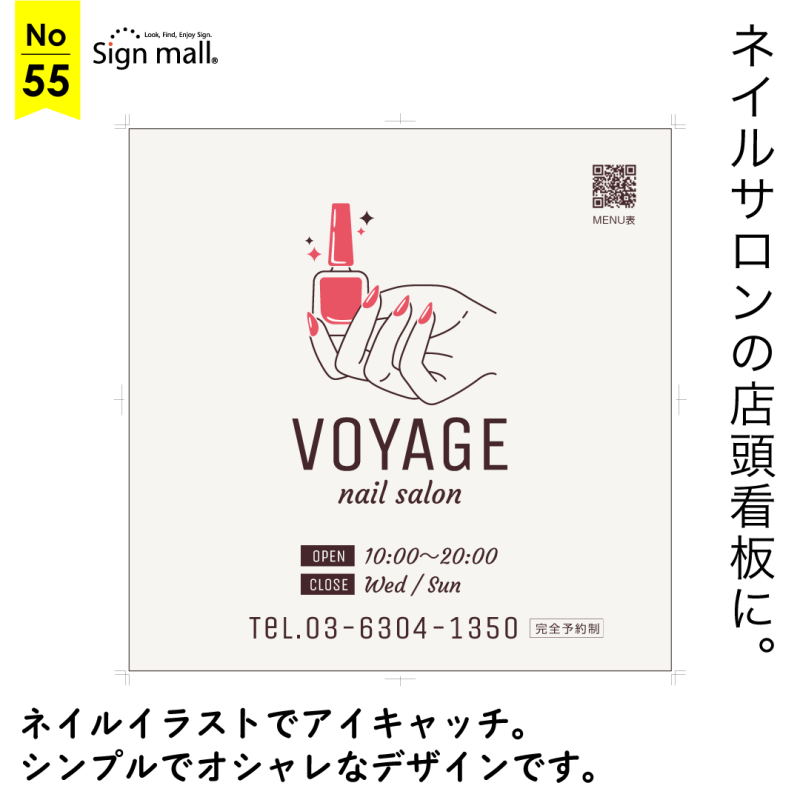 パット見でネイルサロンということがわかるステキなイラストデザインがアイキャッチのオシャレ看板デザイン例。