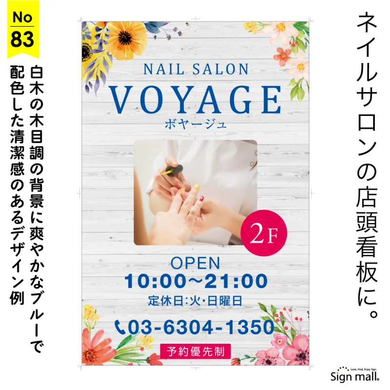 白木テクスチャに爽やかなブルーの清潔感のあるネイルサロン向け看板デザイン例