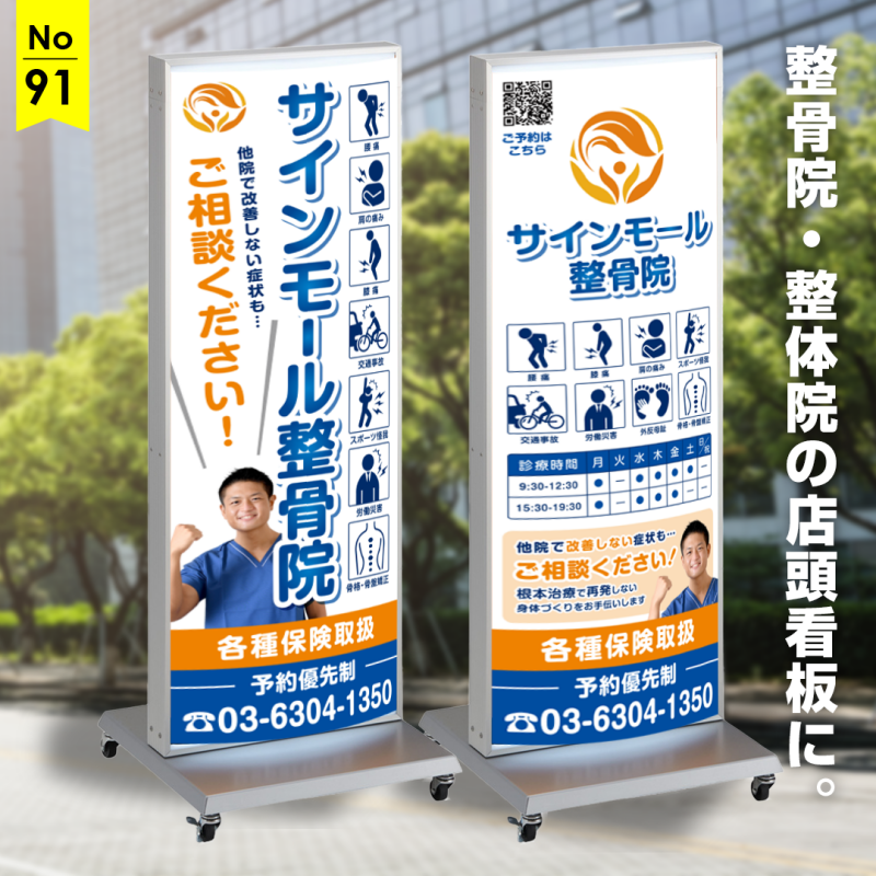 整骨院や整体院向けの店頭看板です。お店の前を通りかかったお客様が「このお店なら安心して施術を受けられそう」と感じられるように、スタッフの顔写真を大きく入れることもおすすめです。顔が見えることで、どんな方が施術してくれるのかがひと目でわかり、親近感を持ってもらいやすくなります。