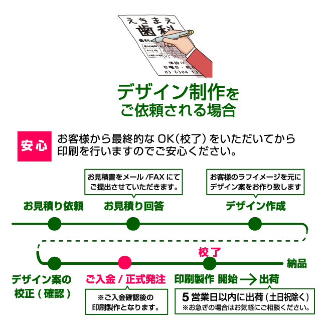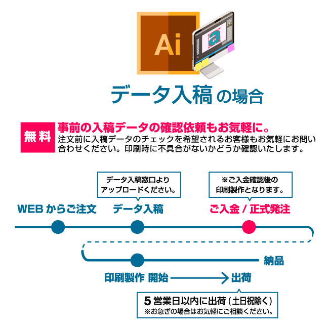 出力サービスの納期はご注文+データ入稿(ご依頼デザイン校了)後の目安納期になります。