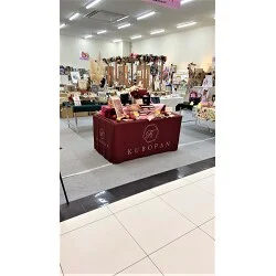 上品な赤が目を引く期間限定洋菓子販売ブースのテーブルクロスを製作いたしました!