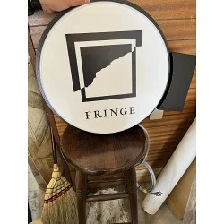 丸型の突き出し看板にオシャレなロゴがプリントされたアートギャラリー様の突き出し看板を製作させていただきました。