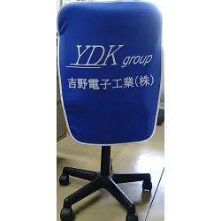 聡明なブルーに社名が映える製造業のオリジナル椅子カバー・テーブルクロスを製作いたしました。